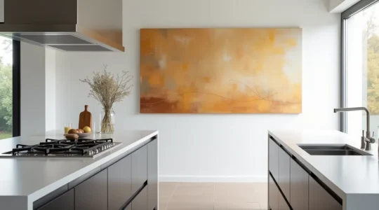 Gemälde sind nicht nur visuell wirksam. Große Leinwände bieten als textile Oberflächen akustische Vorteile: Sie absorbieren Schall und mildern Nachhall in Räumen mit viel Glas, Beton oder Parkett. Dieser Nebeneffekt macht sie zu funktionalen Elementen in offenen Wohnküchen oder Lofts.